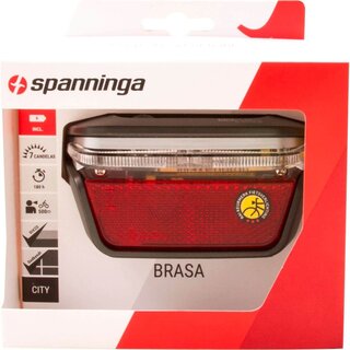 Spanninga achterlicht Brasa XB, batterij, aan/uit knop, LLT technologie (geintegreerde lichtgeleider voor extra zichtbaarheid), 1 LED, 2 x AA batterijen, levensduur batterij > 180u, batterij-laad-indicator, gewicht < 130g, geschikt voor montage op alle dragers met een 50mm of 80mm boutafstand, Duitse StVZO goedkeur, op kaart